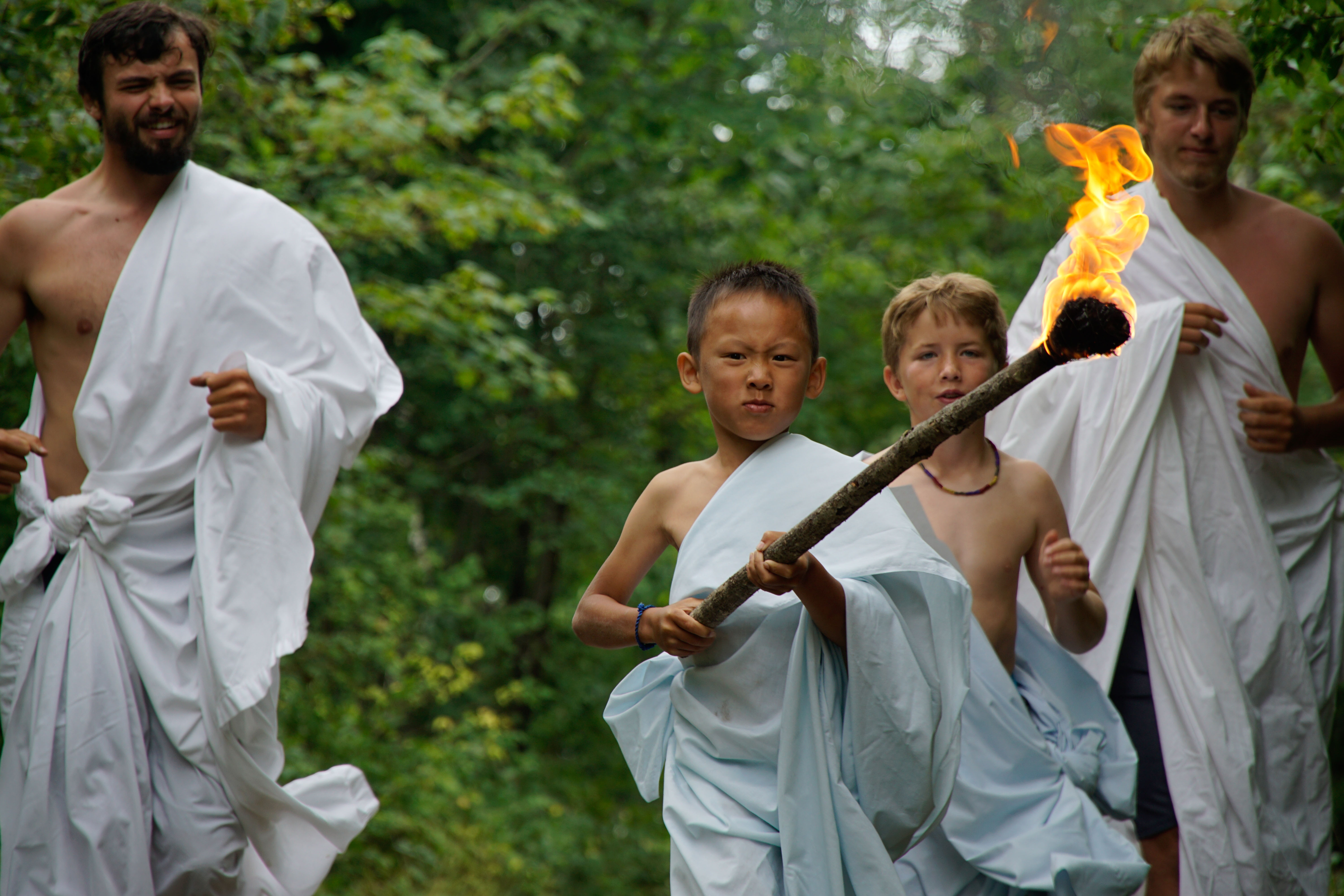 Well, once a summer, athletes from around the world are summoned to the Camp Voyageur peninsula to face off in a series of sports and camp-related activities. A torch is lit, the Star Spangled Banner is played on trumpets, and campers salute the flag. Let the games begin!