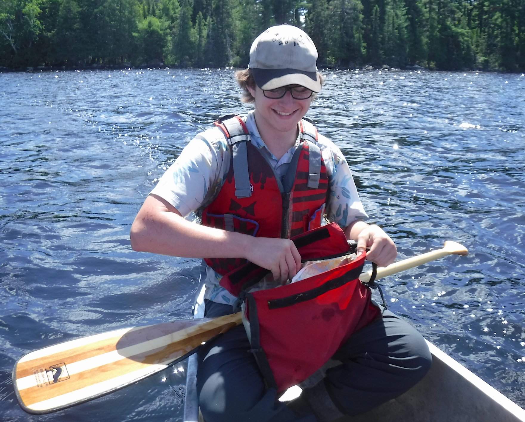 We have seen people carrying gear in school bags, trash bags, and hiking packs. Rather than taking several small bags awkwardly across a portage, why not just take one big organized pack across? Save yourself the hassle and buy or rent for cheap a large portage pack. Put personal items and clothes into two 20-35 Liter dry bags (compression sacks) side by side (think of a jet pack) into a plastic liner or trash bag inside a portage pack.