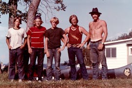 Marcus Freihofer (red t-shirt) & crew wait for transportation back to Camp after their 1975 Pipestone River expedition.