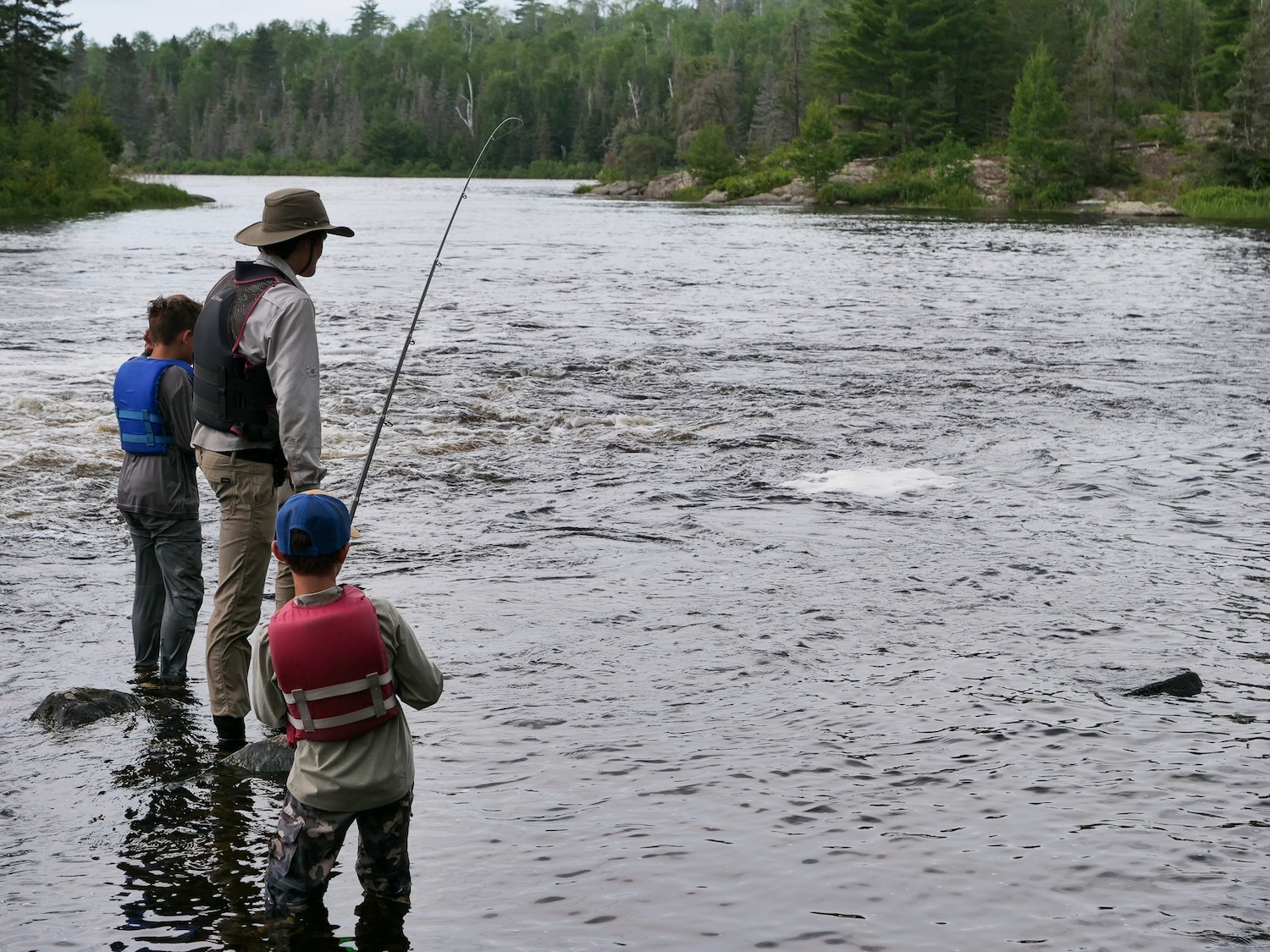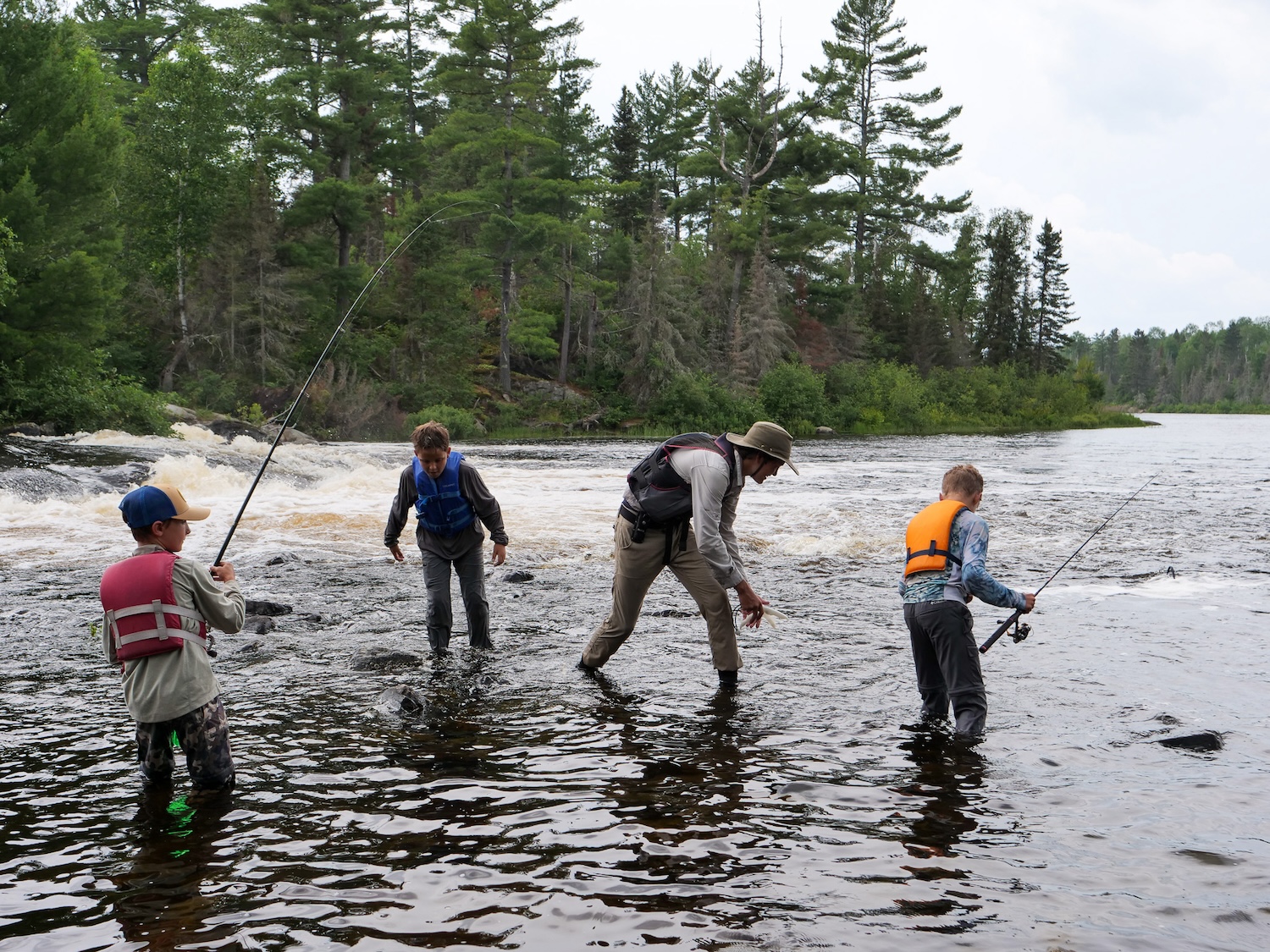 Alex shared that sometimes river fishing is simple: Keep your line wet, cast near moving water, don’t get snagged, and use wacky worms. A few failed attempts casting into stagnant water and snagging crankbaits on sunken logs inspired the boys to try following Alex’s four commandments of fishing. Fishing below swift water, the boys caught a few smallies to shake the rust off their rods and motivate them to keep at it despite several more frustrating snags which Alex and Elena patiently helped untangle.